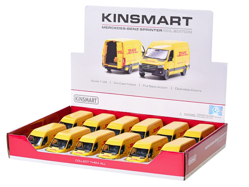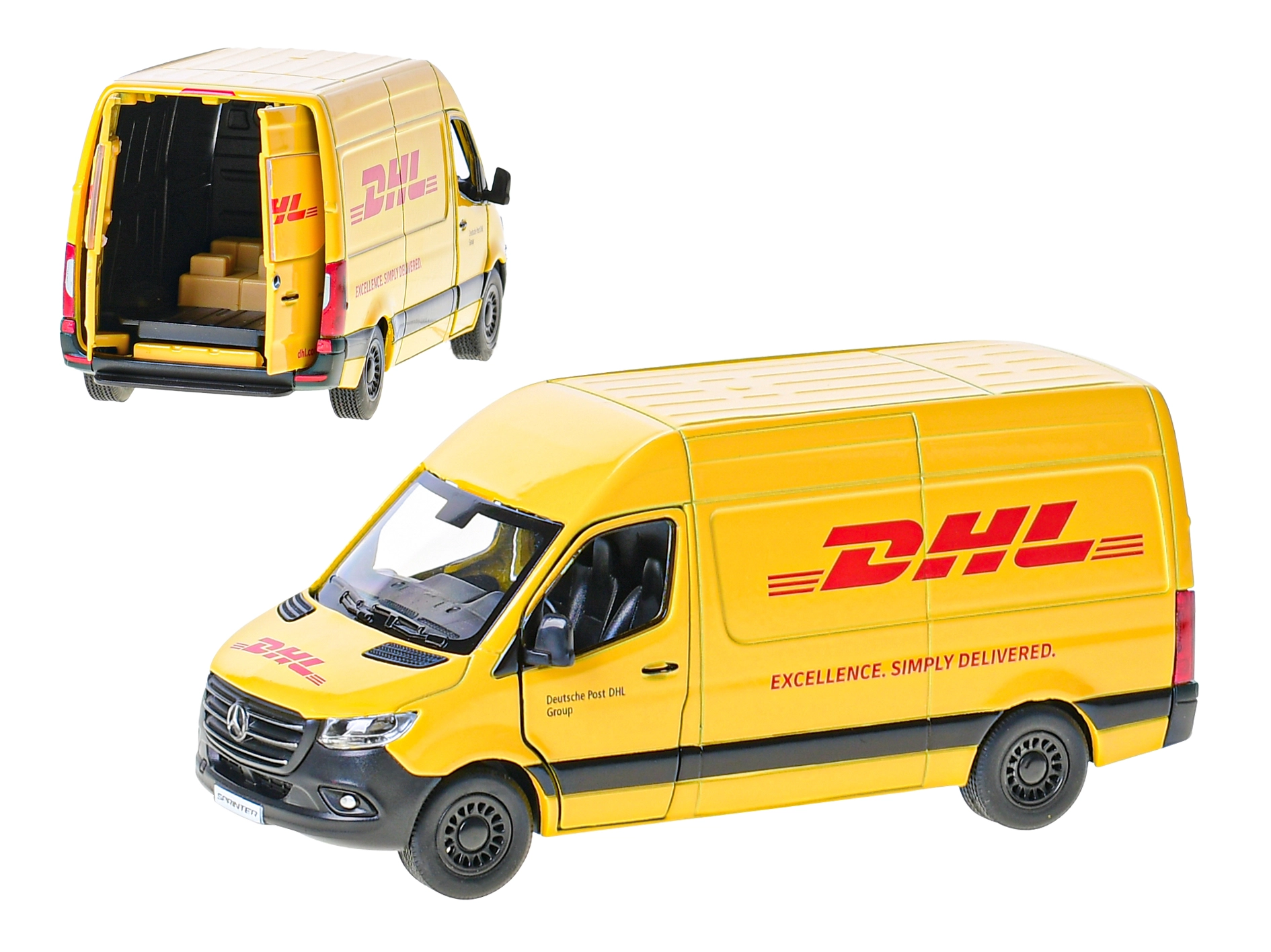 Modello in metallo dettagliato del furgone Mercedes‑Benz Sprinter DHL in scala 1:48, perfetto per bambini e collezionisti. Offre porte laterali e posteriori apribili, meccanismo a retrocarica per avanzare e una realizzazione di qualità in metallo con parti in plastica. Il design giallo con logo DHL autentico lo rende un pezzo attraente sia per la collezione che per il gioco.