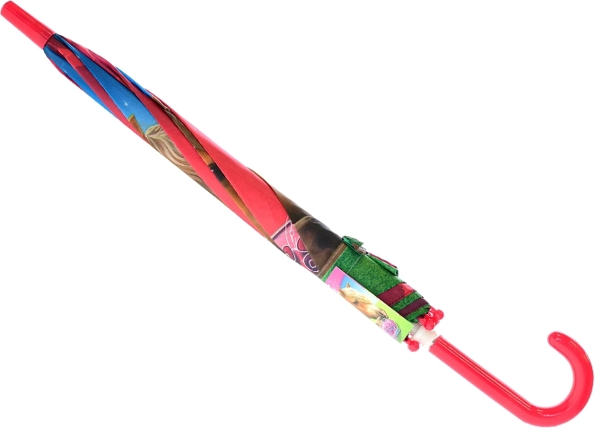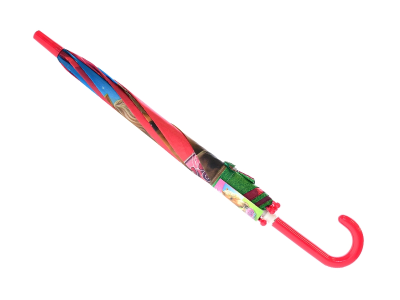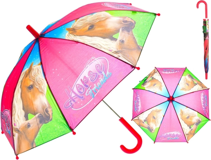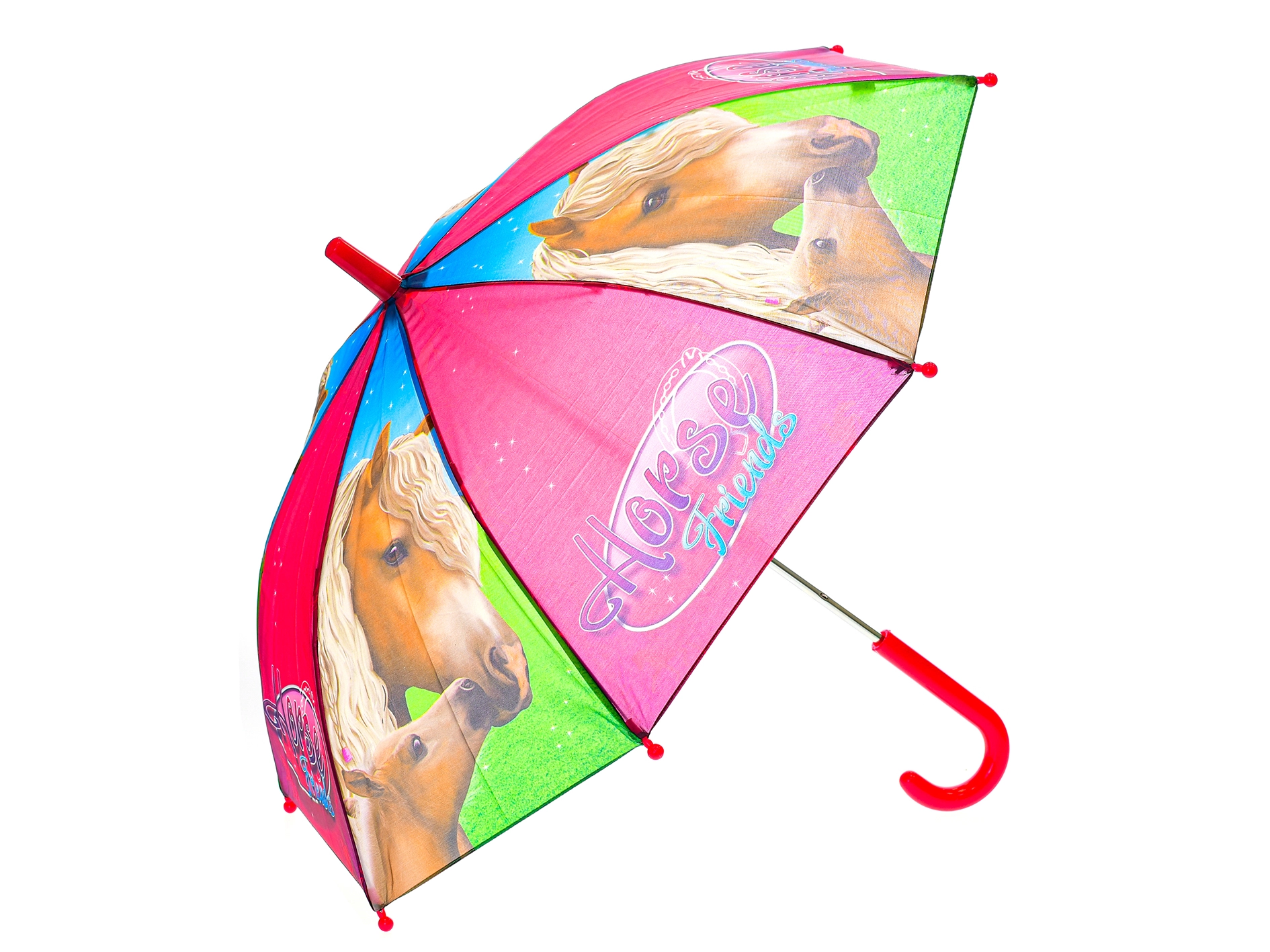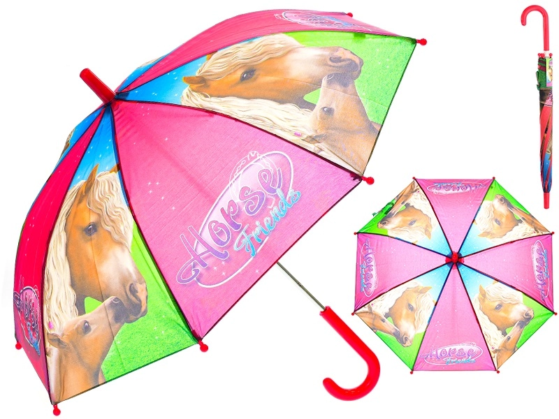 Allegro ombrello per bambini HORSE FRIENDS con stampa colorata di cavallini che rende divertente ogni passeggiata sotto la pioggia. Dispone di puntali delle stecche di sicurezza, robusta struttura in metallo e comoda impugnatura ricurva per un facile trasporto. Leggero e compatto, ideale per la scuola e le gite.
