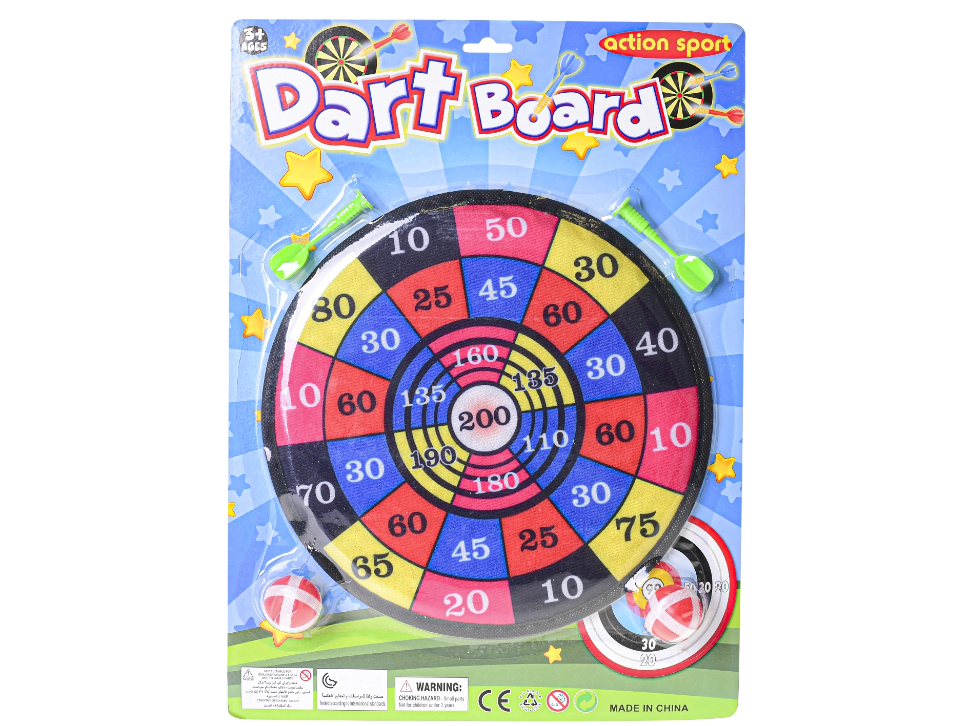 - Set completo: bersaglio, 2 palline e 2 freccette con velcro.