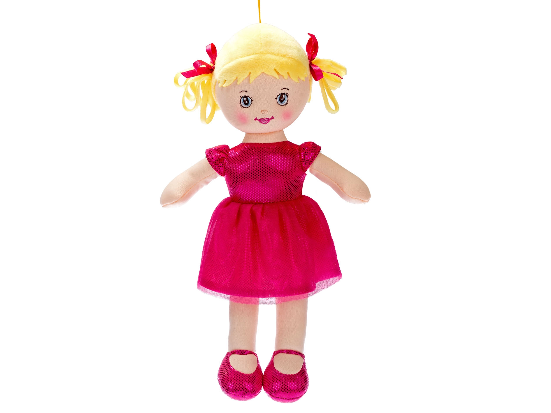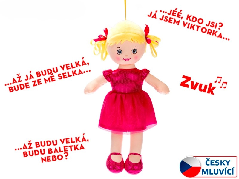 La dolce bambola di pezza morbida Viktorka con vestitino rosa scuro farà felici neonati e bimbi piccoli. Sa parlare e cantare una popolare canzoncina per bambini, è piacevole al tatto e grazie all’altezza di 32 cm si tiene perfettamente anche dalle manine più piccole. Adatta dalla nascita.