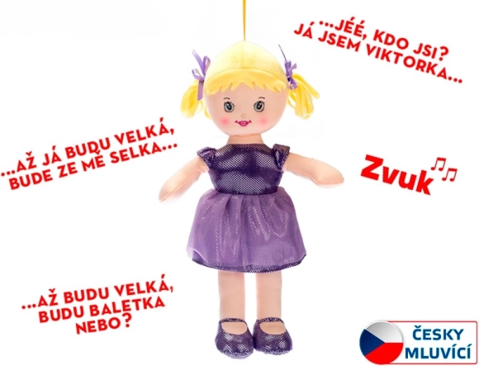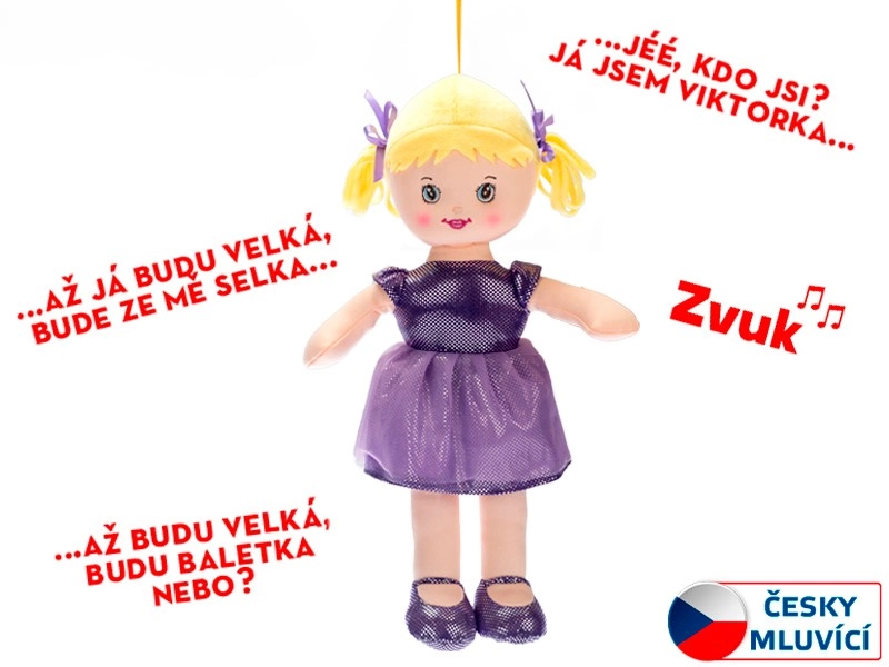 La dolce bambola di pezza Viktorka con un bellissimo vestitino viola farà felici neonati e bimbi piccoli. È piacevolmente morbida, leggera da tenere in mano e sa parlare e cantare in ceco una canzoncina amata. Grazie alla dimensione di 32 cm è ideale per coccole e per i primi giochi ed è adatta fin dalla nascita.