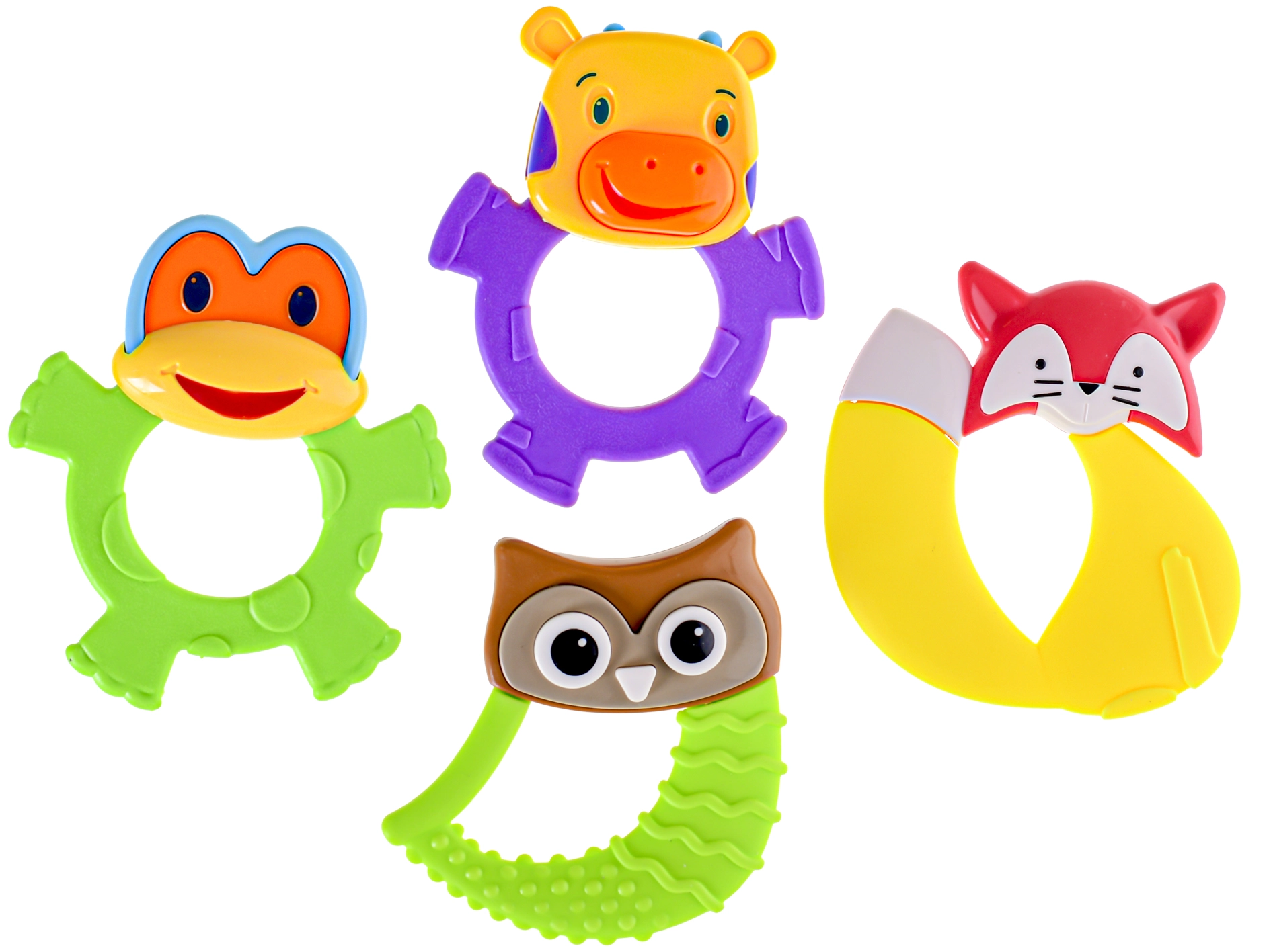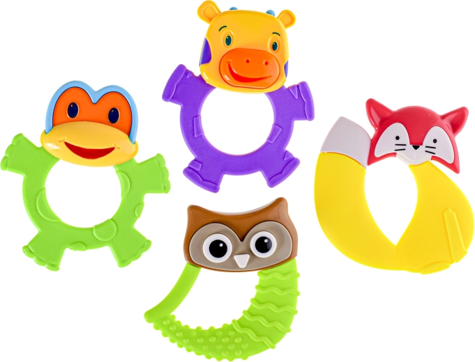Scegliete tra 4 varianti adorabili – gufo, rana, volpe o mucca – in 3 colori vivaci. La finitura liscia e sicura è adatta già dai 3 mesi. Perfetto a casa e in viaggio.