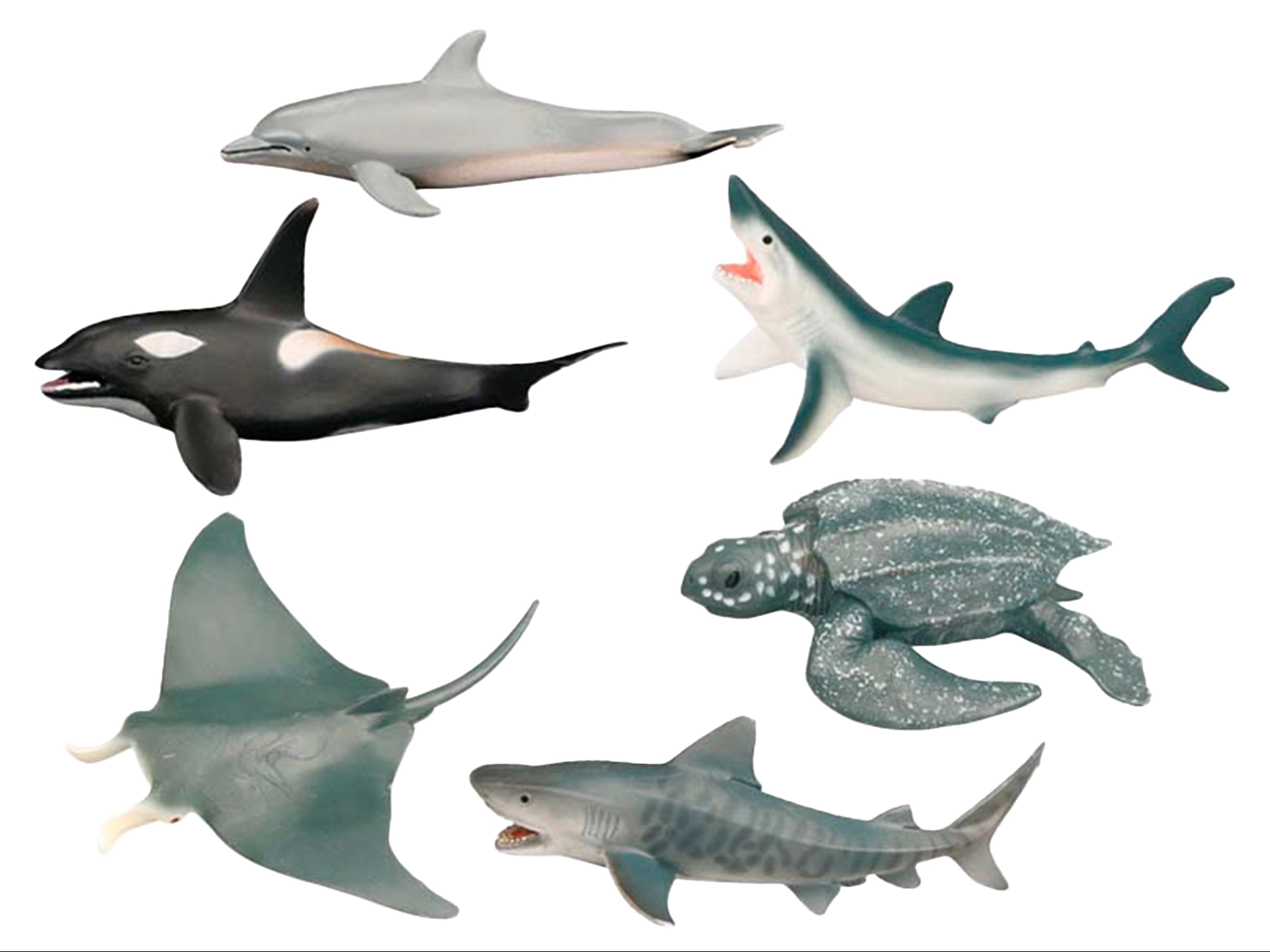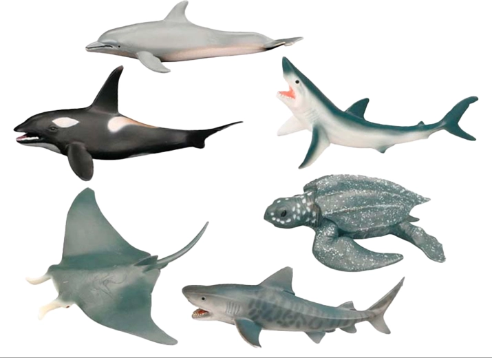 - 6 specie realistiche – orca, squalo, delfino, squalo tigre, manta e foca monaca.