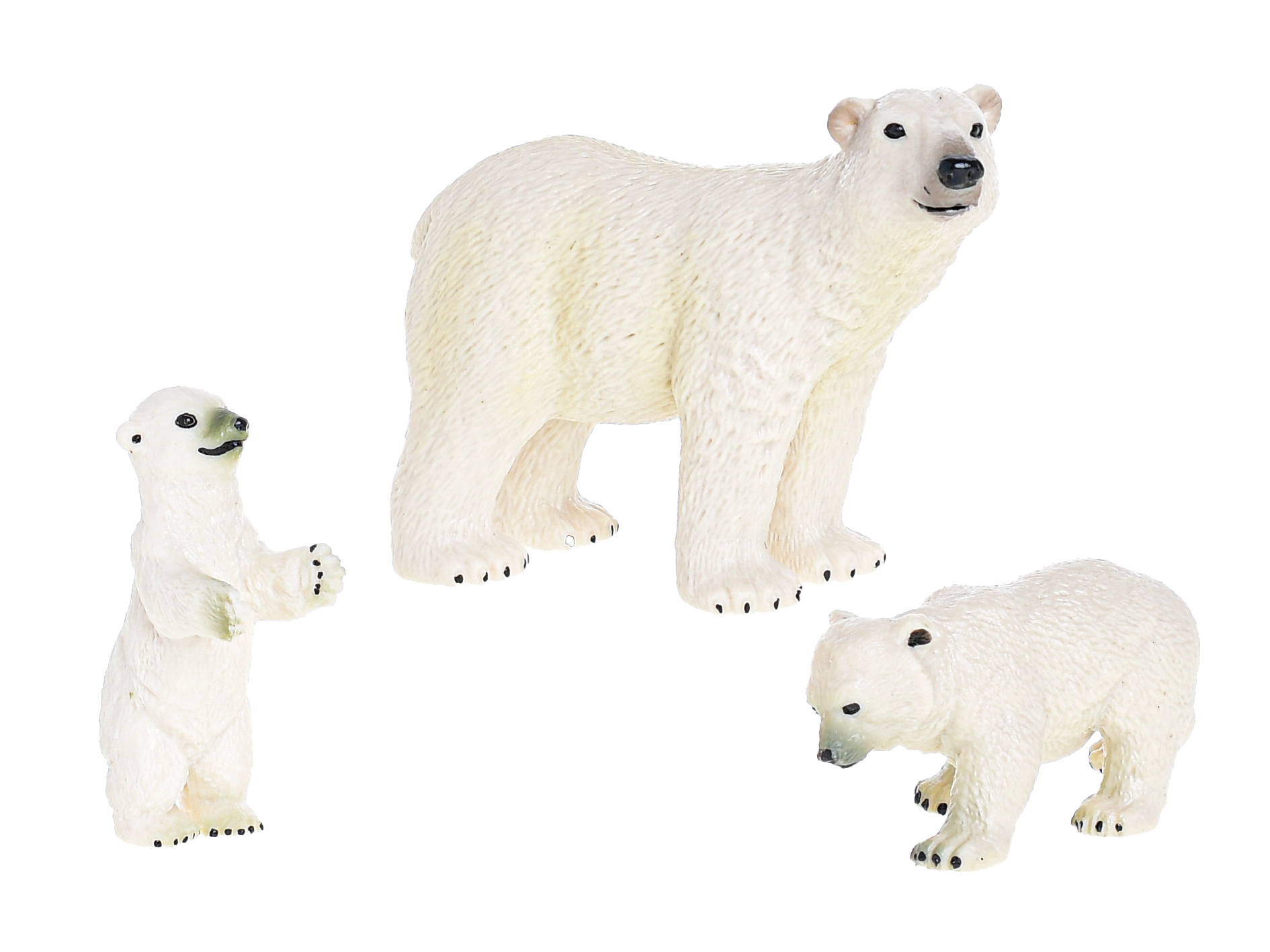 Nella confezione trovi tre figurine: un orso polare adulto e due cuccioli. Dettagli realistici, come la struttura del pelo e le delicate sfumature di colore, rendono il set un ottimo complemento per lo ZOO dei bambini e per attività didattiche.