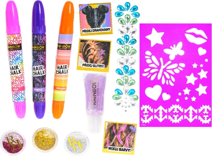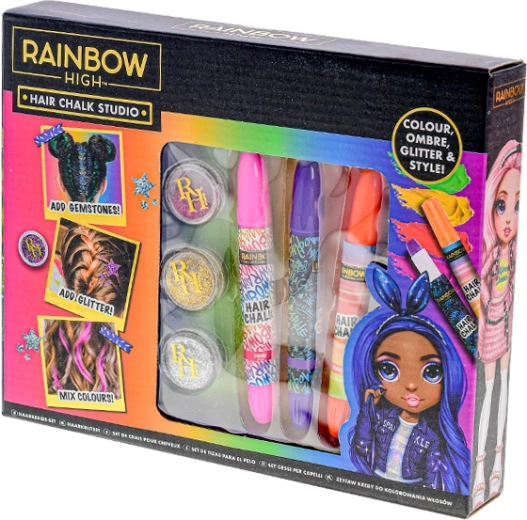Scopri il mondo di stile RAINBOW HIGH e crea un look unico in pochi istanti. Il set è pensato per una decorazione dei capelli sicura e temporanea e stimola creatività e fantasia. Grazie all’applicazione semplice, anche i principianti possono realizzare acconciature d’effetto.