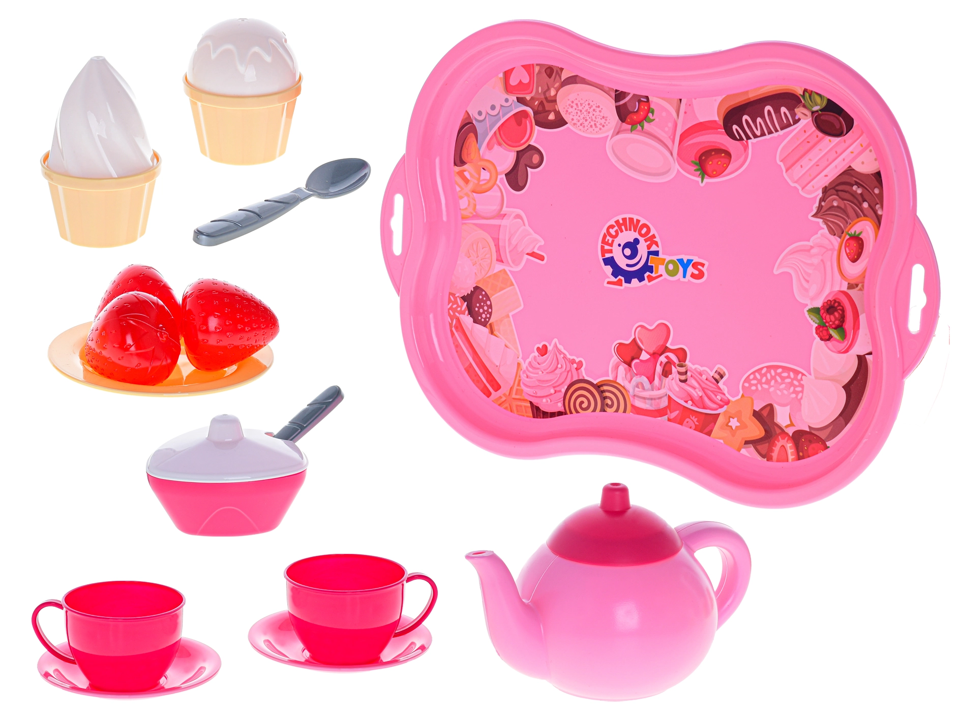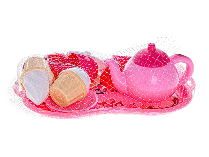 Include un vassoio decorativo, teiera con coperchio, tazzine con piattini, cucchiaini, frutta piccola e dolci in stile gelato. Il set è riposto in una pratica rete, per essere trasportato e riordinato con facilità.