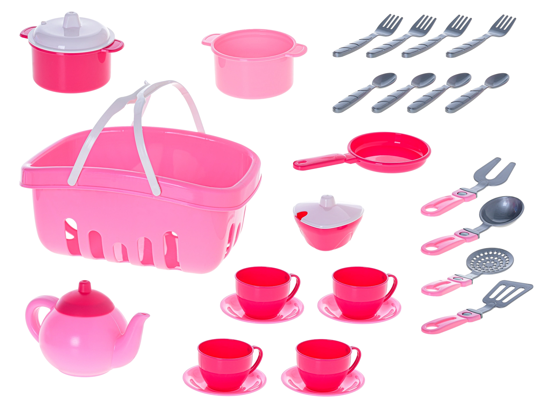 Set completo da 26 pezzi: teiera, pentole, padella, tazze con piattini, posate e utensili da cucina per ore di divertimento.