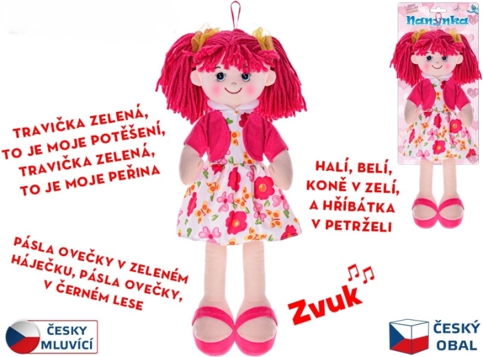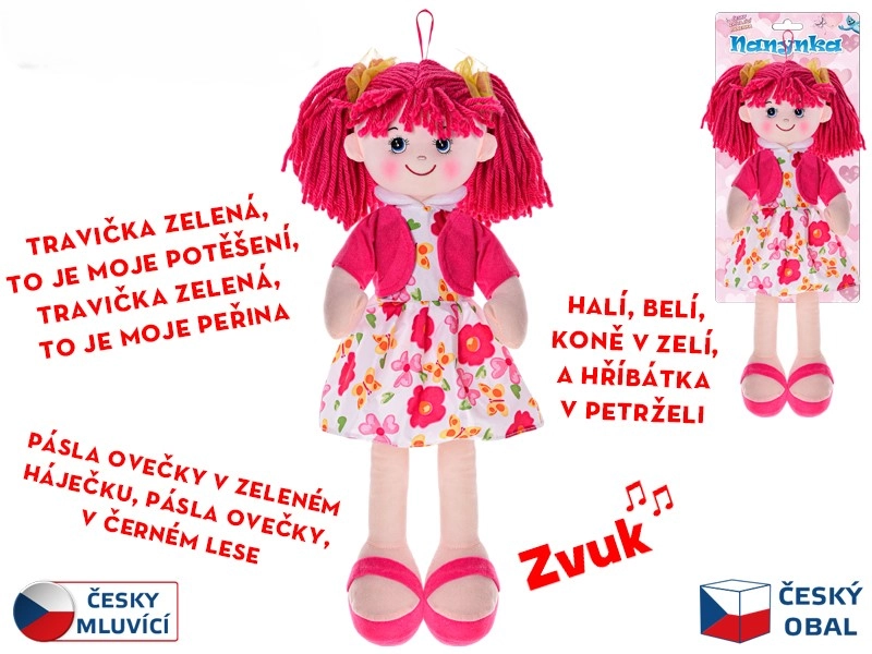 La bambola di stoffa Nanynka incanta i bambini con il suo aspetto delicato e il corpo soffice. Con la sua altezza di 50 cm si tiene facilmente in braccio, si coccola e accompagna i piccoli durante il gioco e la nanna. Premendo il pancino, Nanynka canta amatissime canzoncine ceche (ad es. “Halí, belí…”, “Travička zelená…”, “Pásla ovečky…”) e recita, favorendo lo sviluppo della percezione uditiva, del senso del ritmo e delle abilità linguistiche.