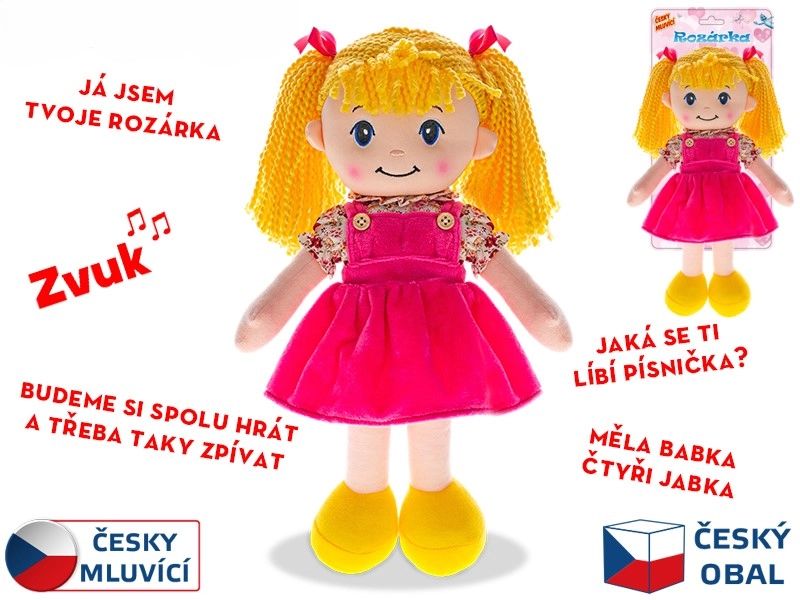 Conosci Rozárka – una delicata biondina con un bel vestitino e i capelli intrecciati in trecce. Grazie al corpo morbido è piacevole al tatto e si adatta perfettamente all’abbraccio dei più piccoli. Parla in ceco, così i bambini arricchiscono naturalmente il vocabolario e le capacità comunicative durante il gioco quotidiano.
