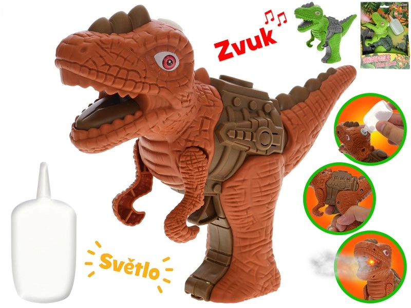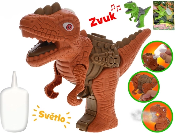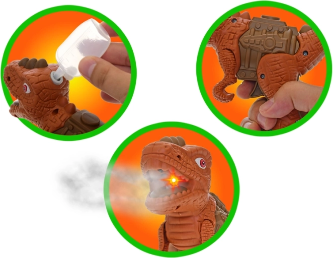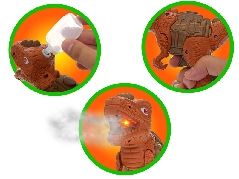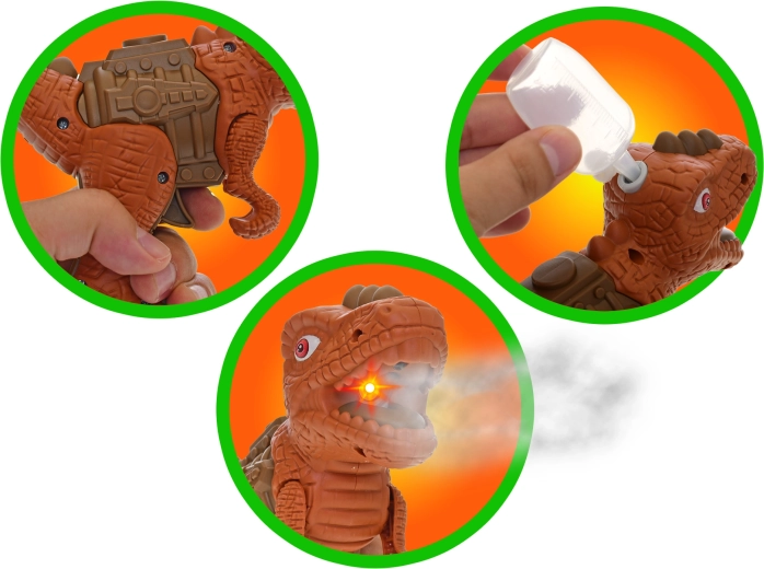 Il giocattolo è disponibile in due colori – arancione e verde, così ogni piccolo avventuriero potrà scegliere il proprio dinosauro. Grazie alle dimensioni compatte è perfetto sia in viaggio che per giocare a casa. Per il funzionamento sono necessarie 2× batterie AA (non incluse) ed è inclusa anche una vaschetta per il rabbocco dell’acqua.