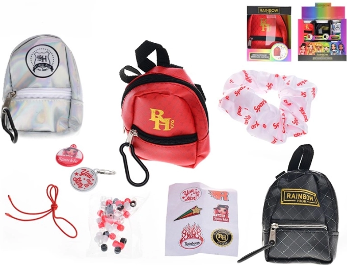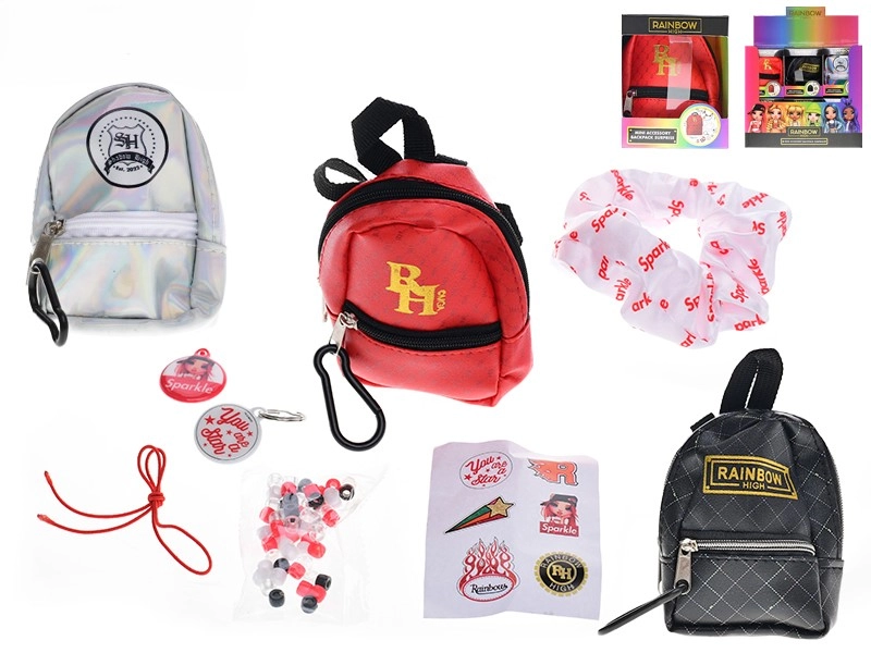 - mini zainetto, elastico per capelli, perline colorate, ciondoli con il logo RAINBOW HIGH