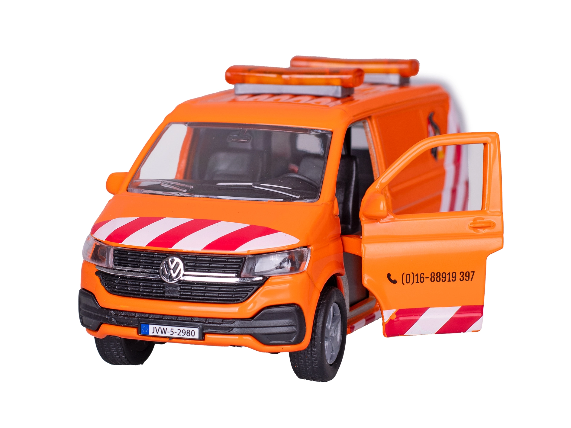 Scoprite il modello dettagliato del VW Transporter, che offre ai bambini un'esperienza autentica del traffico stradale. La carrozzeria in metallo con dettagli in plastica di qualità garantisce resistenza e lunga durata, mentre gli effetti luminosi e sonori aumentano l'attrattiva e il divertimento.