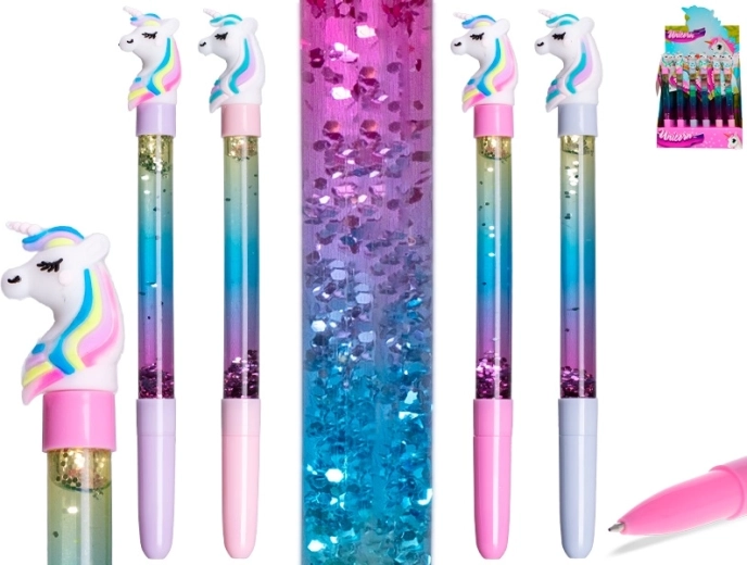 Scopri la magia della scrittura con questa penna giocosa a tema unicorno. Il corpo trasparente è riempito con liquido e glitter che si muovono durante la scrittura creando un effetto magico. Le attraenti varianti viola‑rosa e giallo‑rosa, il plastica resistente e la lunghezza di 19 cm rendono questa penna un accessorio perfetto per bambini dai 3 anni e per gli amanti degli unicorni.