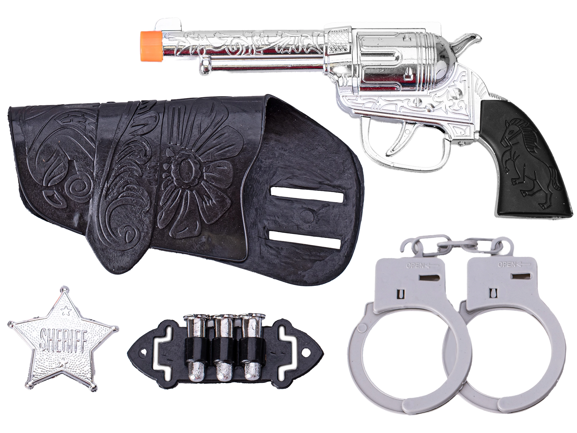- Equipaggiamento autentico: pistola, fondina, manette e stella da sceriffo per un ruolo realistico.