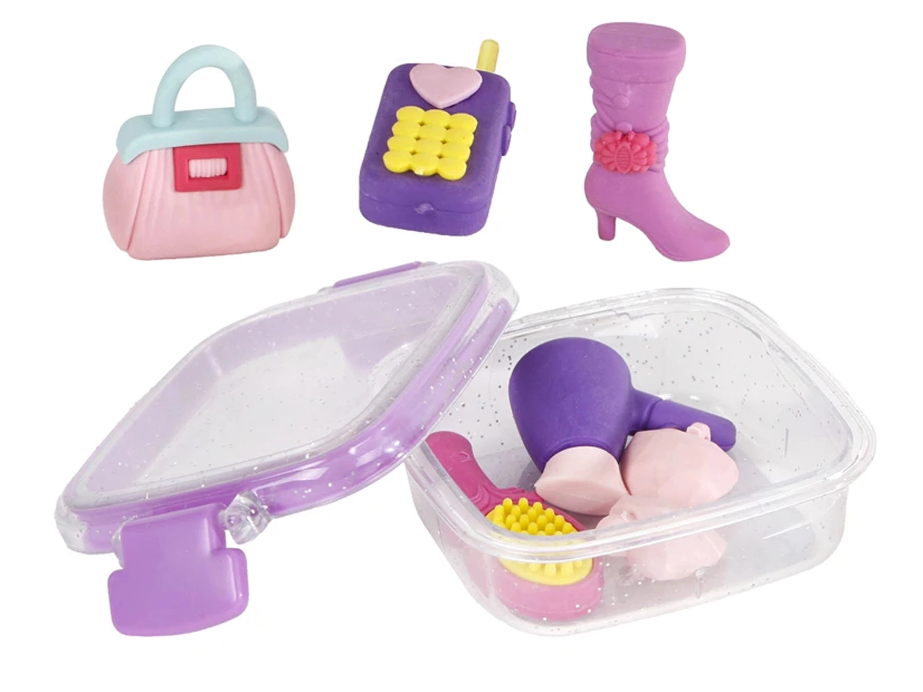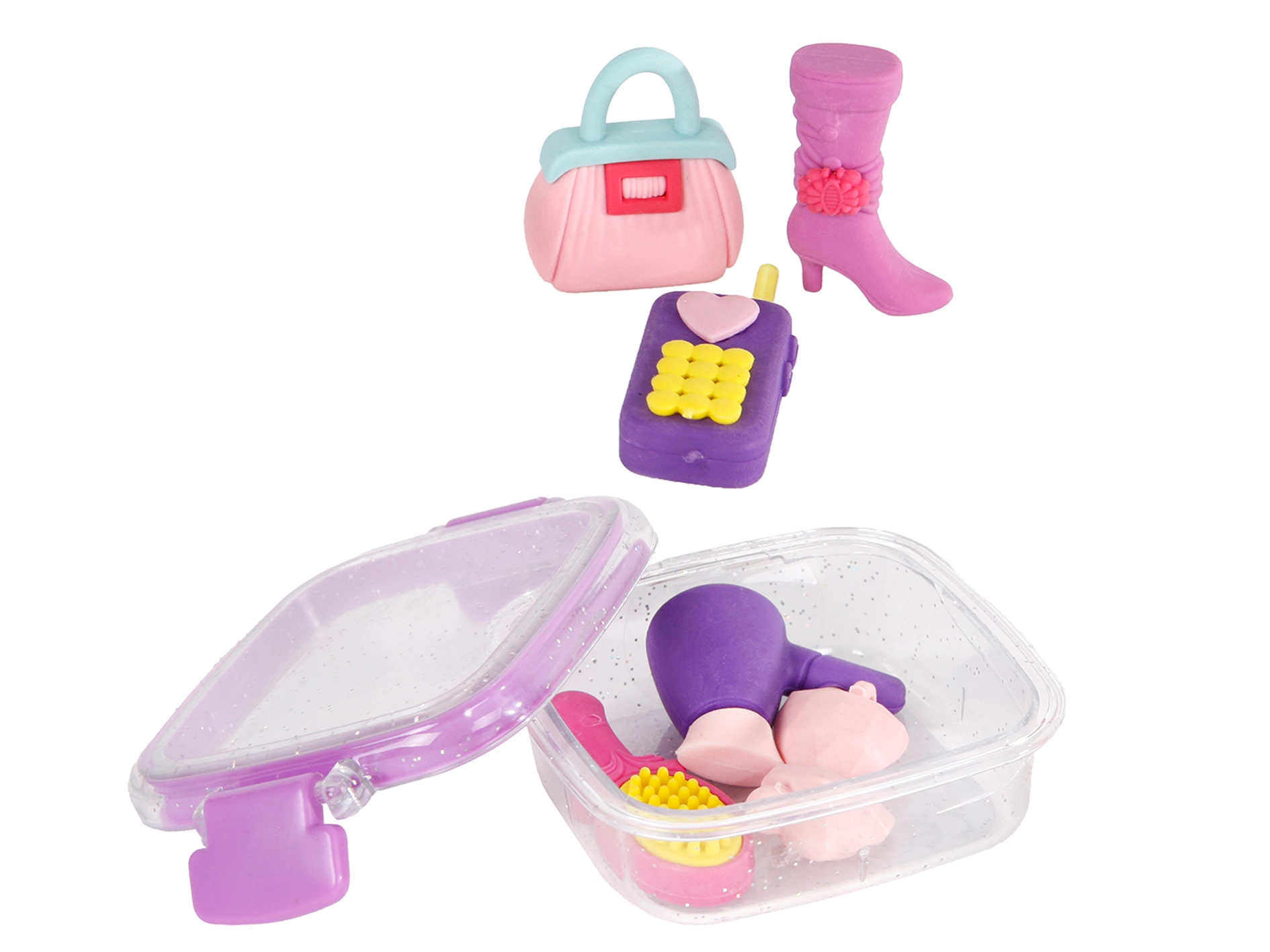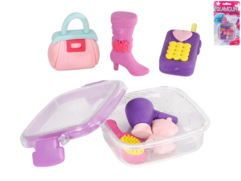 Il set Glamour di gomme, elegante e divertente, porta allegria e praticità nell'astuccio scolastico. Contiene 8 gomme originali a forma di accessori di moda, come telefono cellulare, scarpa e borsetta. Ogni gomma, realizzata in gomma di qualità, garantisce cancellature fluide ed efficaci senza danneggiare la carta, è resistente e, grazie alla pratica scatolina, è sempre a portata di mano. Un'ottima scelta per bambini dai 3 anni.