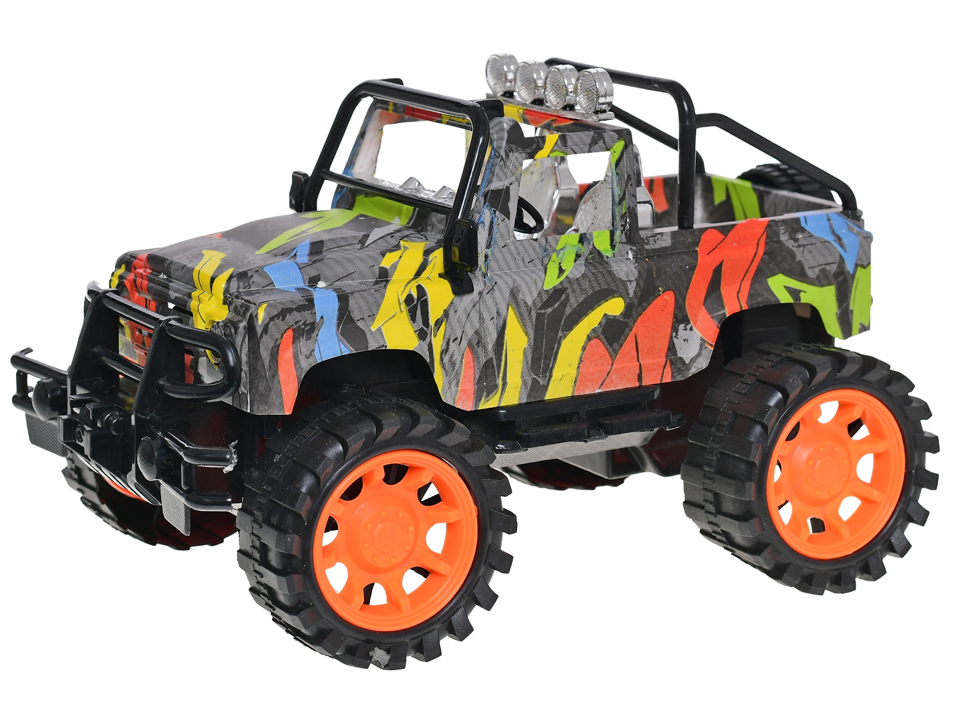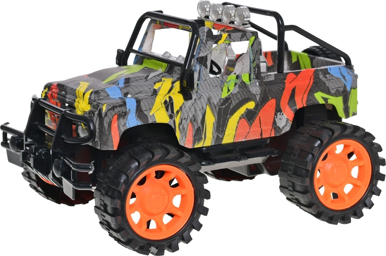 Elegante modello in plastica di auto fuoristrada in scala 1:14, colpisce per il moderno design graffiti e offre divertimento duraturo senza batterie. Grazie al pastore a volano è facile da controllare, ha una lunghezza di 26 cm per un'esperienza di guida realistica ed è adatto ai bambini dai 3 anni.