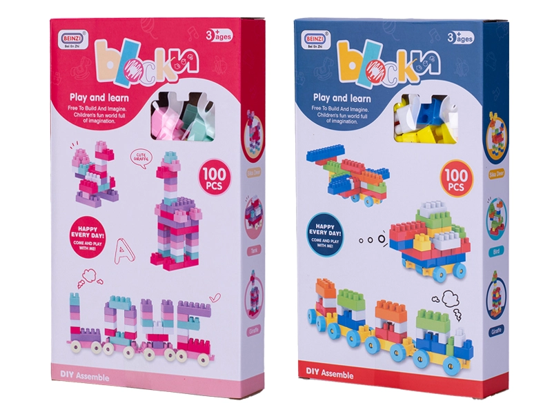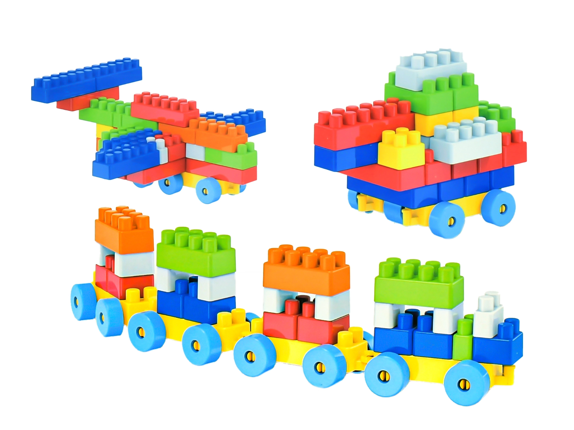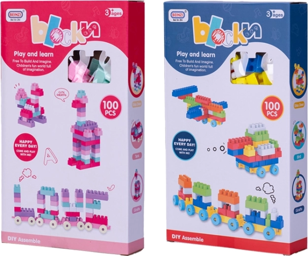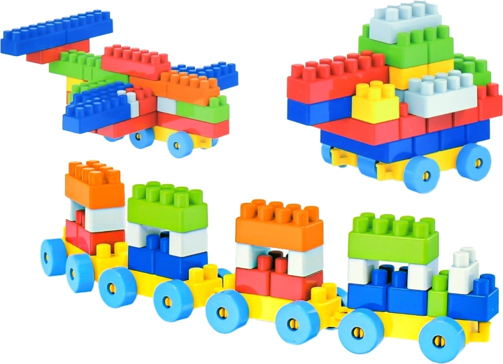 Questo set di costruzione universale offre 100 pezzi in plastica robusta, inclusi telai con ruote per creare facilmente modelli mobili. I bambini possono montare un trenino con vagoni, una macchinina o un piccolo aereo e combinarli liberamente.