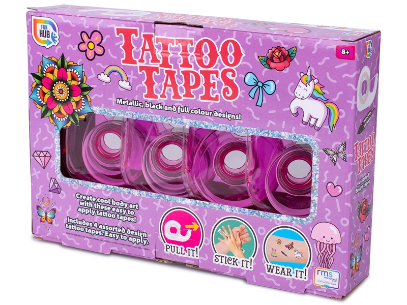 Scopri divertenti e creativi nastri adesivi con motivo tatuaggio per bambini dagli 8 anni. Ogni confezione offre 4 nastri autoadesivi con diversi disegni, per decorare in modo originale materiale scolastico, regali e diari. I nastri in carta crespata sono leggermente traslucidi, facili da rimuovere e non lasciano residui di colla. La pratica scatolina con dentini taglienti garantisce uno strappo facile e un uso comodo in ogni momento.