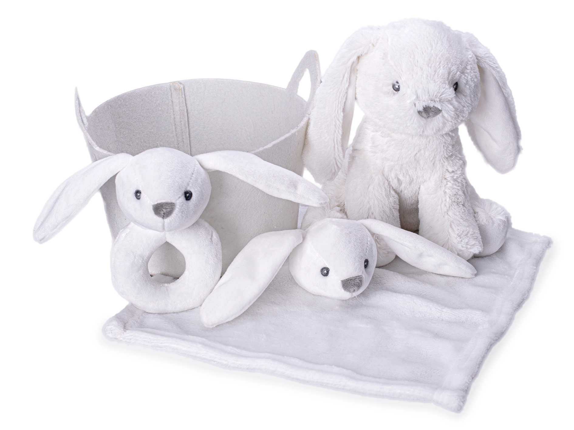 - Set completo: coniglietto di peluche 20 cm, sonaglino 13 cm, copertina nanna, cestino in tessuto