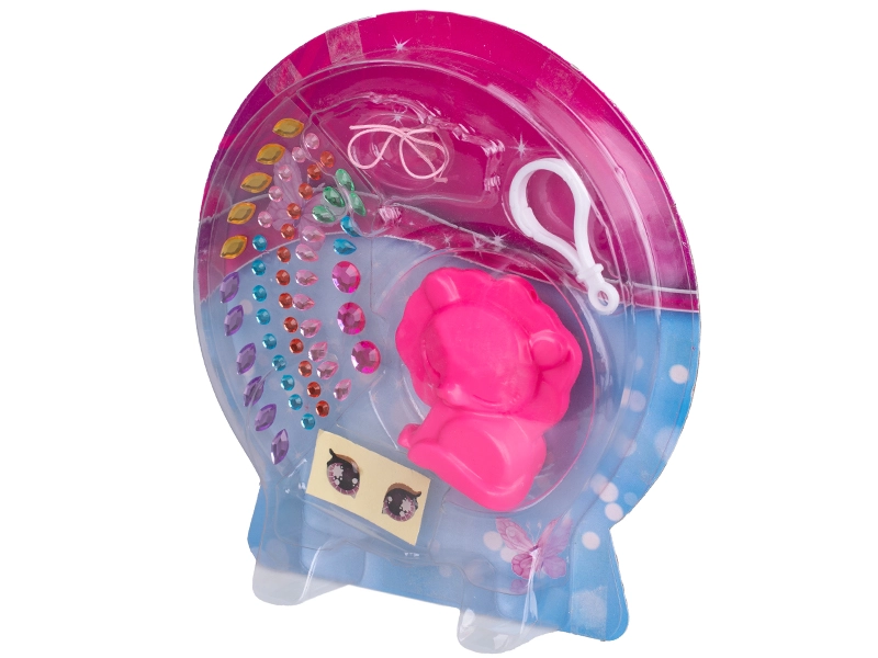 Il set comprende l’animaletto, il moschettone, strass colorati e adesivi per gli occhi – senza bisogno di altri strumenti.