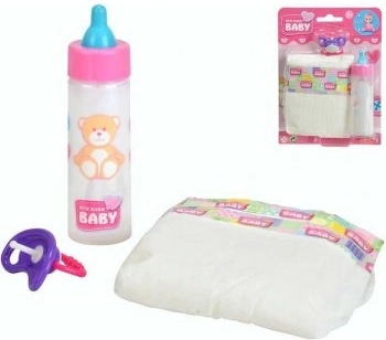 Pratico set di accessori per bambole della linea New Born Baby che include ciuccio, pannolino e biberon con latte che scompare, che crea un divertente effetto durante il “bere”. Ideale per i bambini che vogliono giocare alla cura del bebè. Adatto per bambole da 38 a 43 cm.