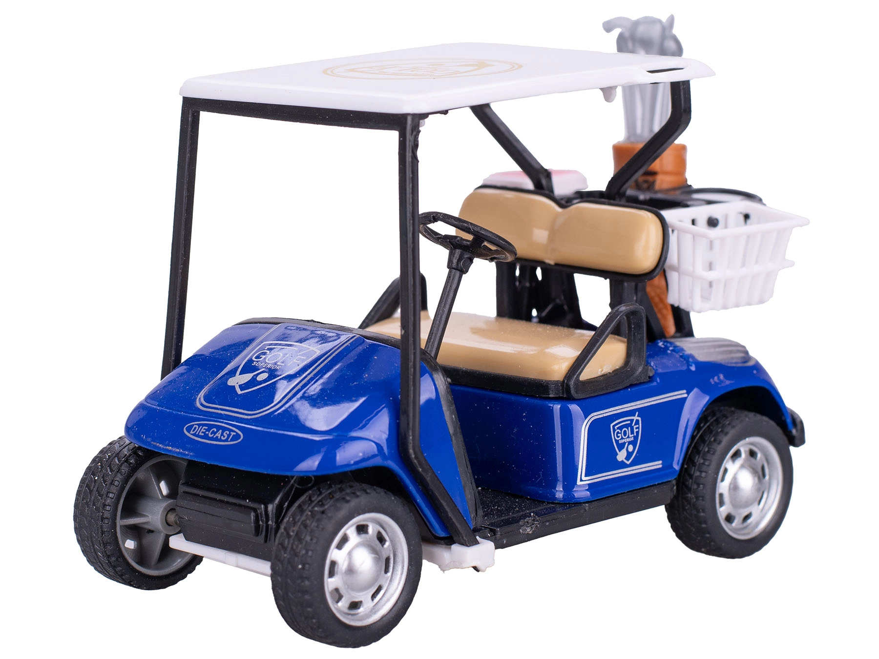 Modello dettagliato di carrello da golf lungo 10 cm che combina metallo e plastica per una maggiore resistenza e un aspetto realistico. Grazie alla retrocarica si muove da solo dopo averlo tirato indietro, offrendo ai bambini ancora più divertimento. Inclusi una set di mazze da golf e una pratica scatolina per riporlo facilmente. Ideale per bambini dai 3 anni, piccoli sportivi e collezionisti di modelli.