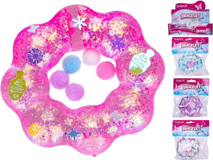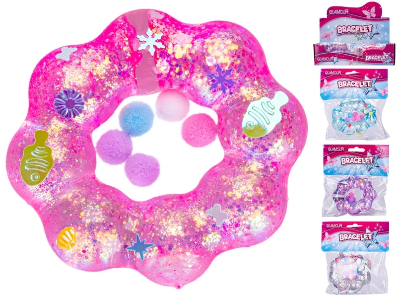 Elegante bracciale elastico con diametro di 8,5 cm che colpisce per il suo design lucente con paillettes e glitter. Grazie al materiale flessibile, si adatta facilmente a diverse misure di polso e offre comodite0 di utilizzo per bambini e adulti. Disponibile in quattro colori accattivanti 96 viola, rosa, turchese e grigio. Inoltre, funziona come strumento antistress da schiacciare e allungare durante la giornata.