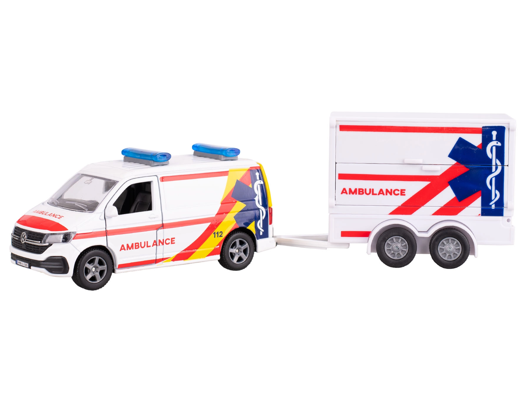 Modello realistico di ambulanza VW Transporter in scala 1:16 che entusiasmerà piccoli e grandi appassionati di auto. Combina metallo e plastica per resistenza e leggerezza, dispone di retrocarica, porte apribili e include un rimorchio per ancora più possibilità di gioco. Lunghezza 27,5 cm, ideale per giocare in casa e all’aperto, adatto ai bambini dai 3 anni.