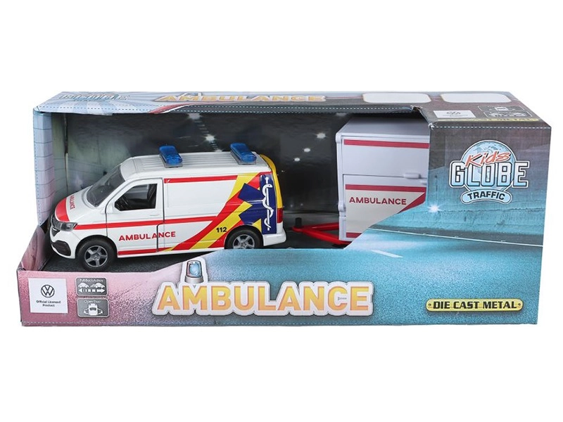 Scopri il modello dettagliato Kids Globe Traffic dell’ambulanza VW Transporter con rimorchio, che offre un aspetto realistico e ottime funzionalità per il gioco creativo. Grazie alla combinazione di metallo e plastica, il veicolo è resistente ma leggero e facile da manovrare. La retrocarica e le porte apribili aumentano il realismo del gioco e i bambini si divertiranno sia in casa che all’aperto.
