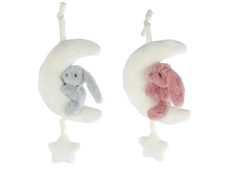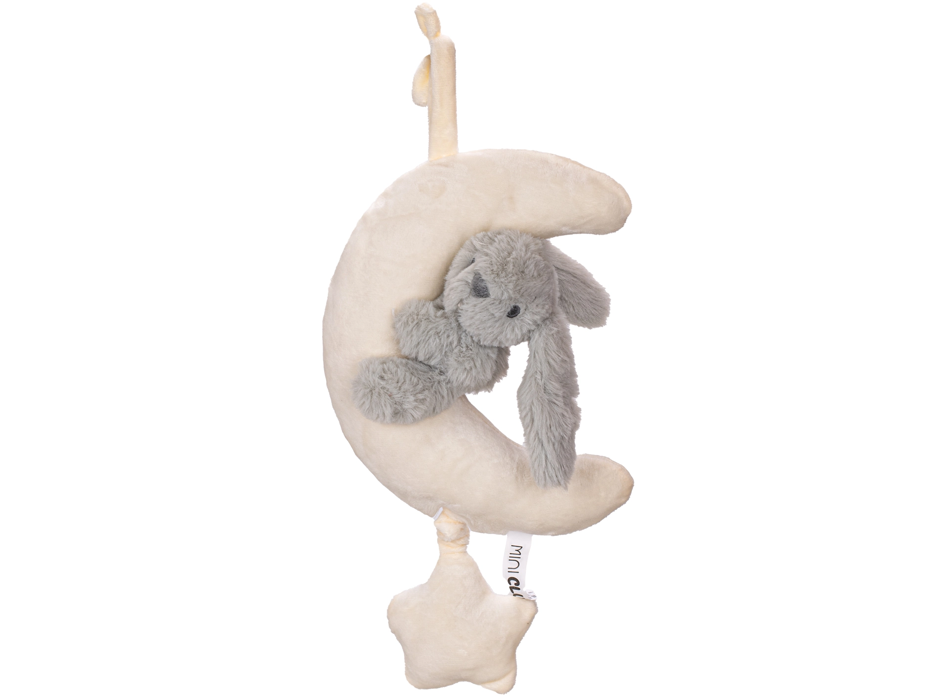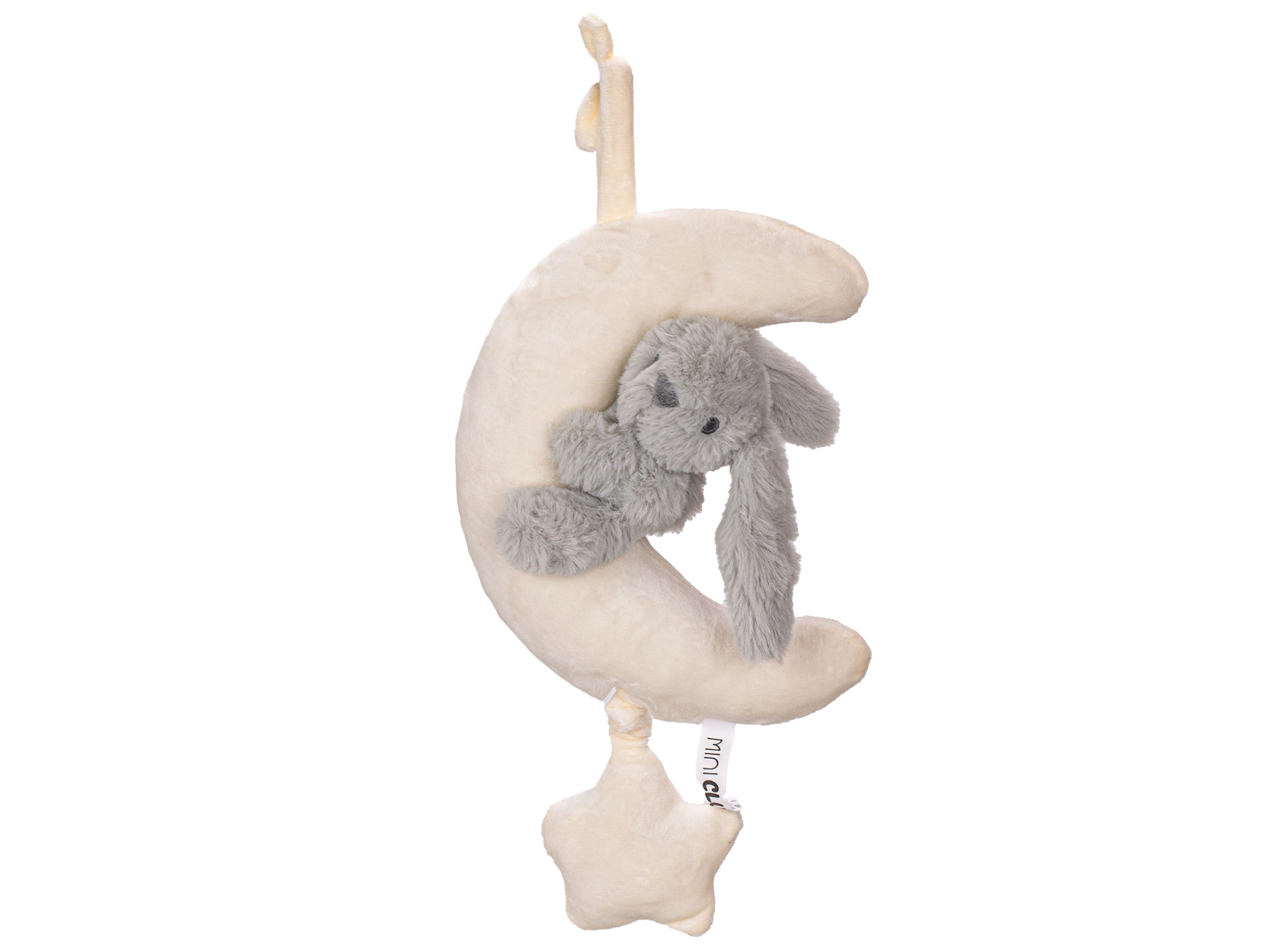 Porta nel mondo dei più piccoli la luce soffusa della luna e la morbidezza del peluche. Questo gioco da appendere a forma di luna con un dolce coniglietto conquista con la sua superficie morbida e, dopo la carica, offre una melodia delicata per un addormentamento sereno. Grazie alla struttura leggera, si fissa facilmente alla culla, al passeggino o alla palestrina.