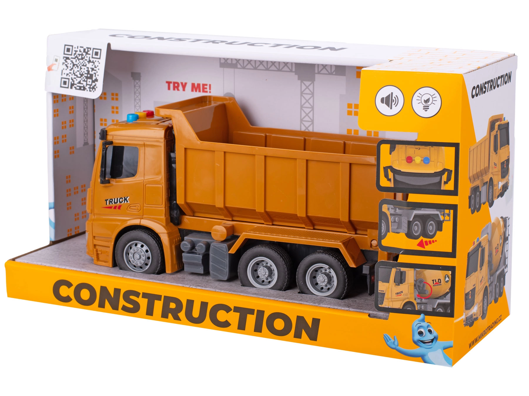 Per un’autenticità ancora maggiore non mancano effetti luminosi e sonori, che si attivano premendo un pulsante. Il cassone ribaltabile permette di caricare e scaricare il “materiale” come su un vero autocarro. Il resistente materiale plastico è adatto al gioco in casa e all’aperto, e il giocattolo è sicuro per bambini dai 3 anni in su.