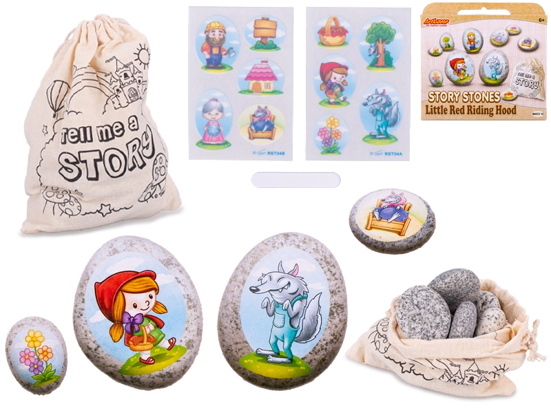 Scopri la magia della fiaba classica con un set creativo di sassolini che i bambini possono trasformare in mini-scene ispirate alla storia di Cappuccetto Rosso. Il set include 10 sassolini naturali e una serie di adesivi con personaggi ed elementi della fiaba. Sostiene la motricità fine, le competenze linguistiche e la creatività, ed è ideale per creare a casa o in viaggio grazie alla pratica scatolina.