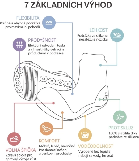 ATTIPAS sono scarpine intelligenti progettate in collaborazione con pediatri e ortopedici per ricordare il più possibile la camminata a piedi nudi. Grazie alla punta extra ampia offrono spazio naturale alle dita e favoriscono un corretto schema di passo. La suola in silicone TPR morbida e flessibile è antiscivolo, mentre la comoda tomaia “tipo calzino” in cotone è altamente traspirante.
