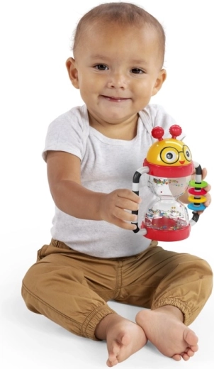 La sezione trasparente in stile clessidra con perline colorate crea un piacevole tintinnio e un effetto visivo che cattura l’attenzione del bambino.