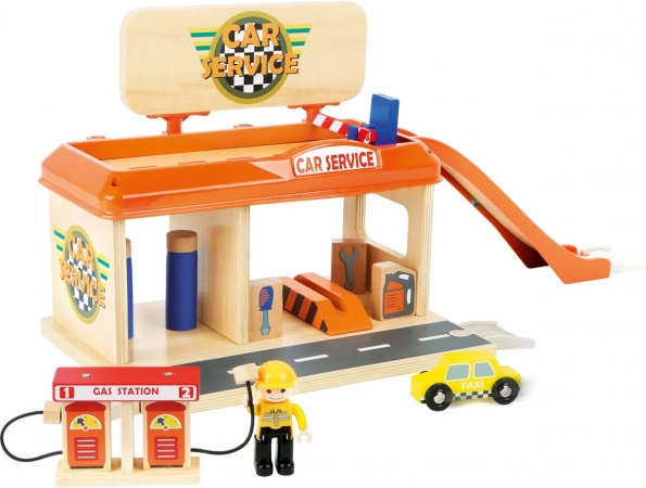 Stazione di servizio e autofficina in legno per bambini con accessori