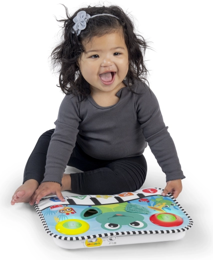 Questo tappetino multifunzionale unisce una giostrina musicale per lettino e un pannello attivo da pavimento. Grazie alla morbida imbottitura è ideale per neonati e bimbi piccoli: dal gioco da sdraiati al tummy time fino alle prime sedute autonome. I bambini possono scalciare sui 5 “tasti” illuminati, premere i pulsanti e scoprire suoni di marimba, melodie ed effetti giocosi.