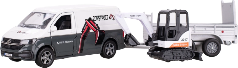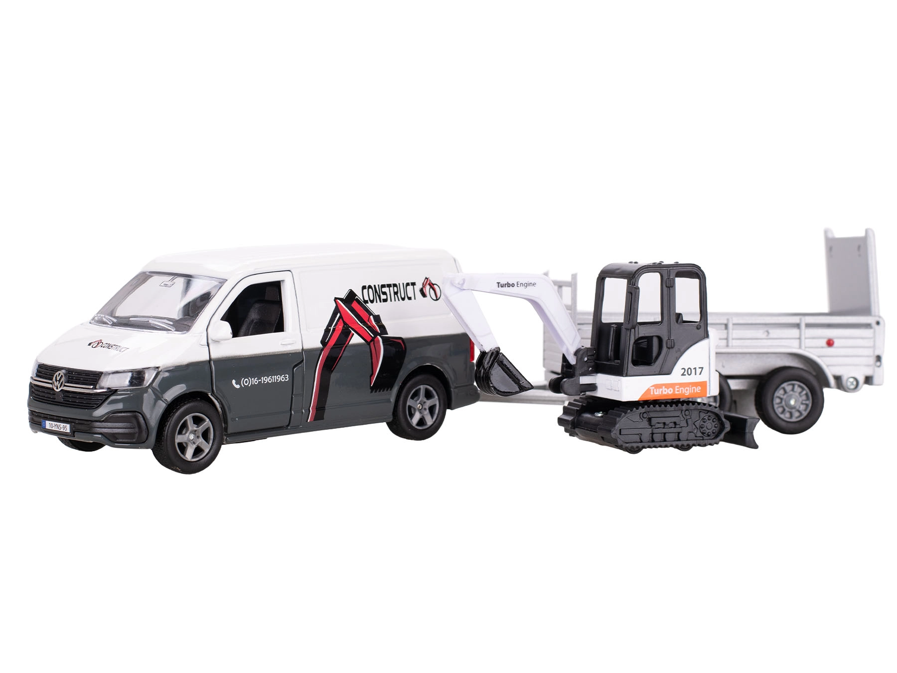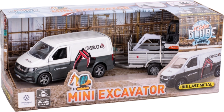 Con il set Kids Globe Traffic i bambini creano facilmente il proprio cantiere. Il realistico VW Transporter con retrocarica trasporta in sicurezza il mini escavatore sul rimorchio staccabile, pronto per iniziare subito i lavori di “scavo”. La struttura resistente in metallo e plastica garantisce una lunga durata anche con un uso intensivo.