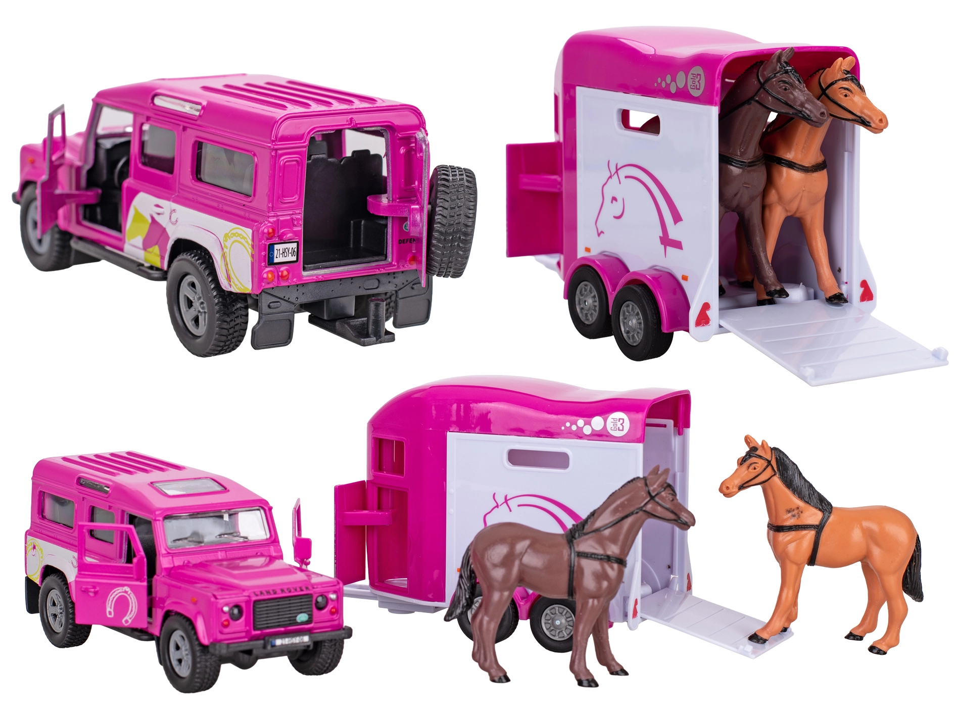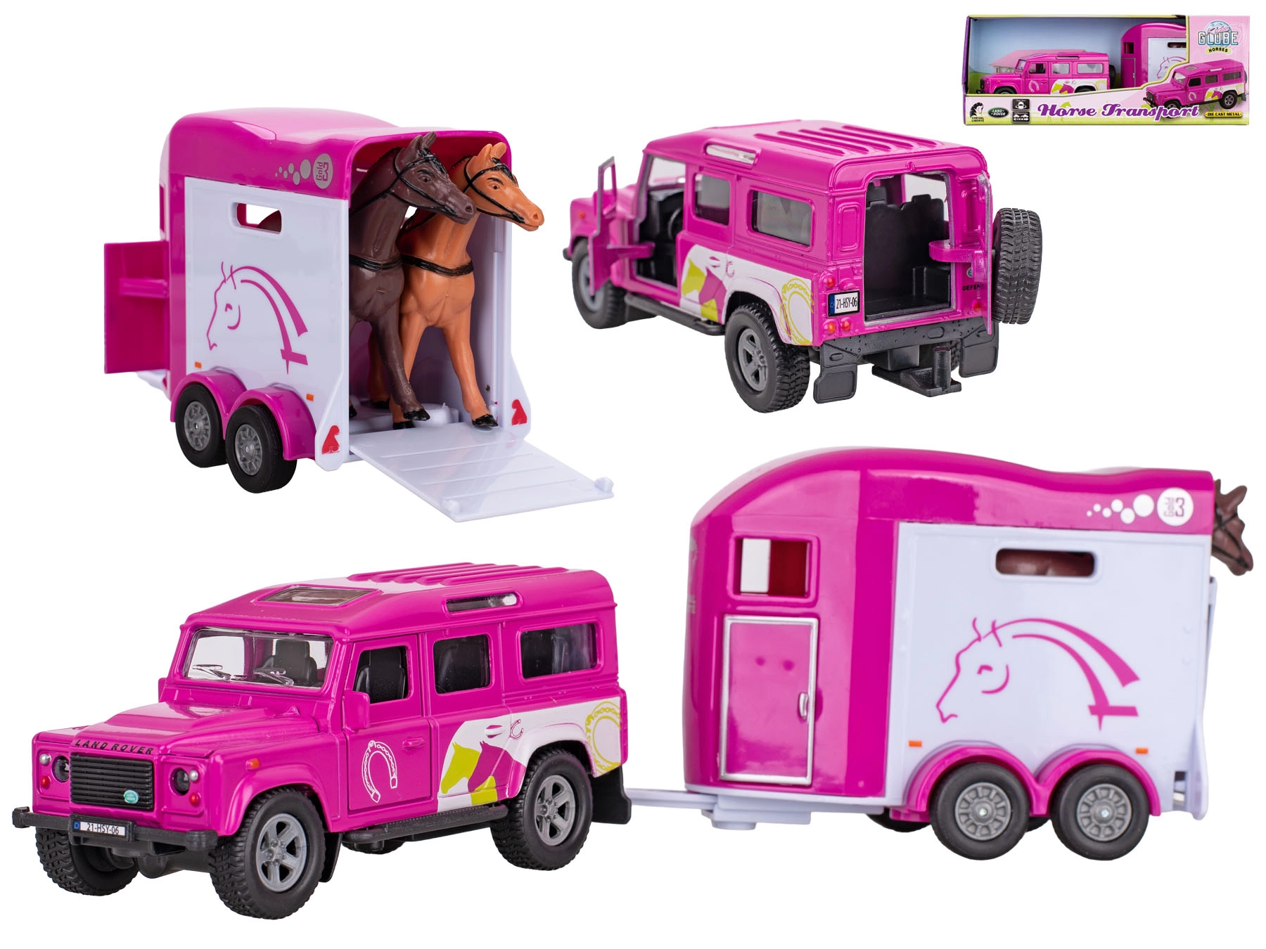Elegante modello in metallo di Land Rover con rimorchio per cavalli in colore rosa, che farà felici tutte le piccole amanti dell’equitazione e della fattoria. Offre retrocarica per una guida facile, porte anteriori apribili e una struttura resistente in metallo e plastica. Il rimorchio è pronto per il trasporto sicuro di figurine di cavalli (non incluse). Lunghezza del set 28 cm e confezione in scatola lo rendono un ottimo regalo per bambini dai 3 anni in su.