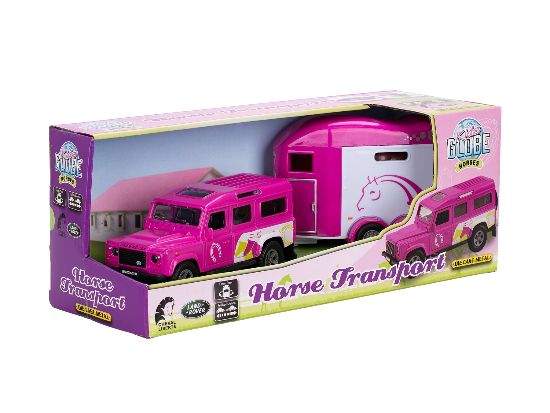 Scoprite il set realistico Kids Globe con l’iconico Land Rover e il rimorchio per il trasporto dei cavalli in un attraente colore rosa. La carrozzeria e gli interni dettagliati, le porte anteriori apribili e la retrocarica garantiscono tante possibilità di gioco e divertimento. Grazie alla combinazione di metallo e plastica di qualità, il modello è resistente e pronto per il gioco quotidiano.