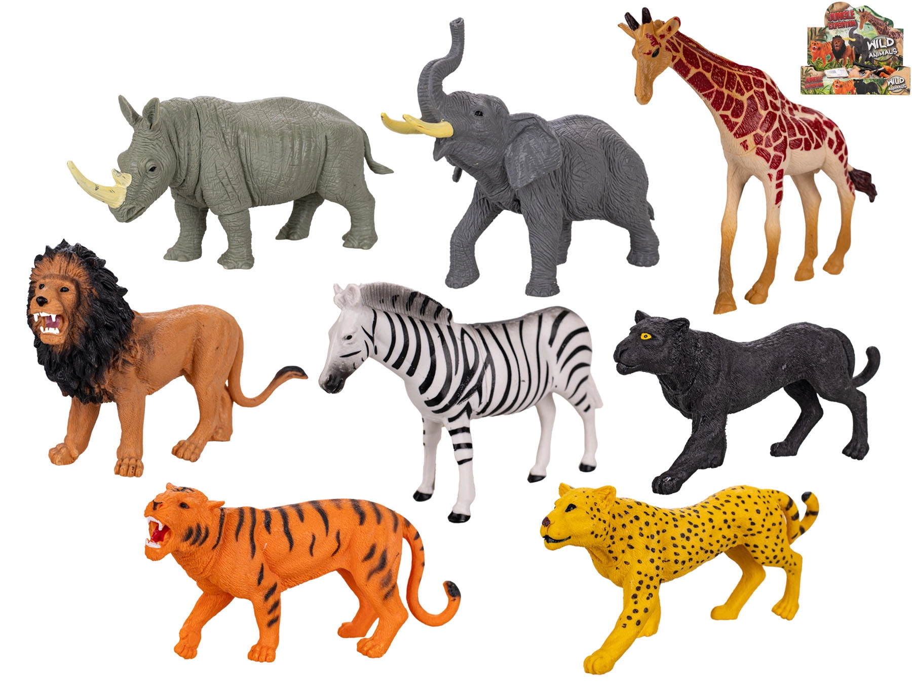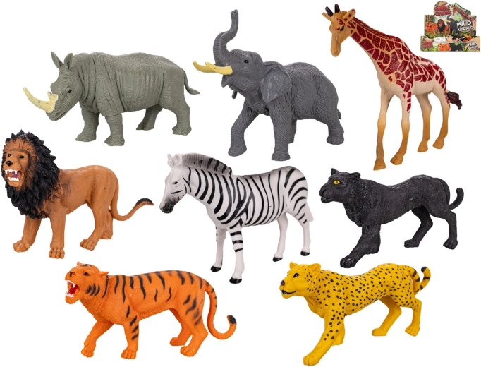 - 8 figurine realistiche: zebra, giraffa, tigre, giaguaro, leopardo, rinoceronte, leone ed elefante