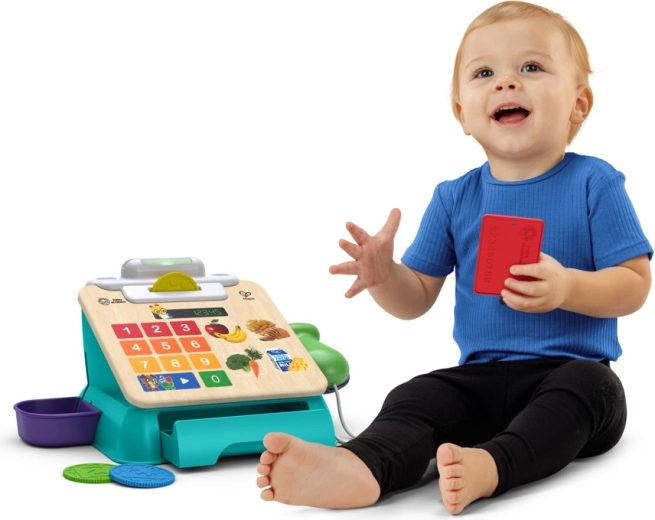 Cassa interattiva per bambini con tecnologia Magic Touch che combina legno certificato FSC e plastica resistente per un gioco sensoriale sicuro. Offre luci, melodie, suoni da cassa e frasi parlate, insegna numeri e alimenti in quattro lingue e favorisce la motricità fine e il gioco di ruolo. Include scanner, carta di credito e 3 monete e un pratico cassetto portaoggetti per gli accessori.