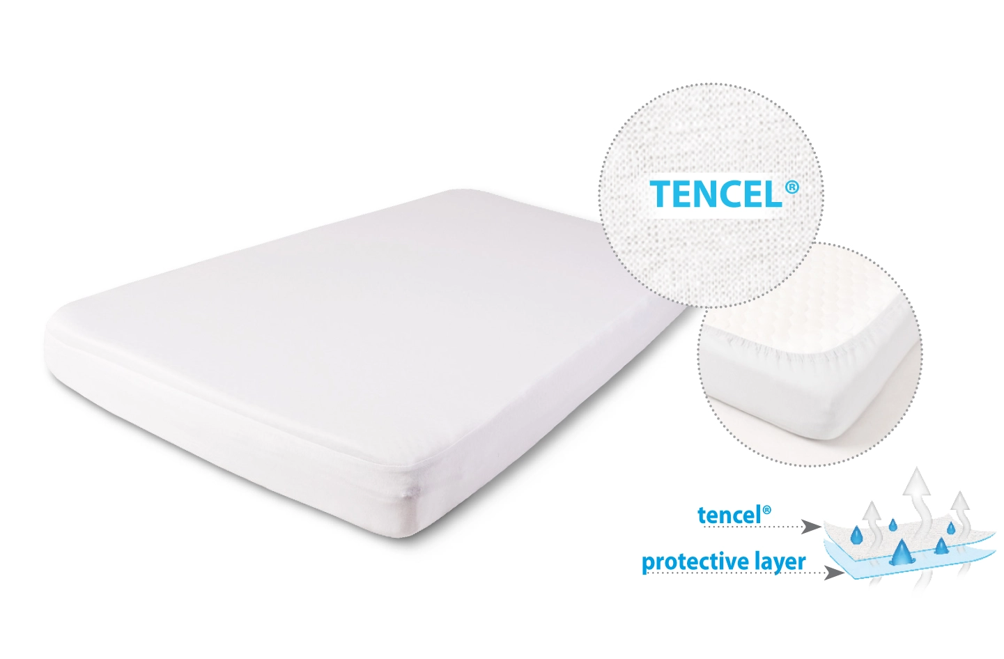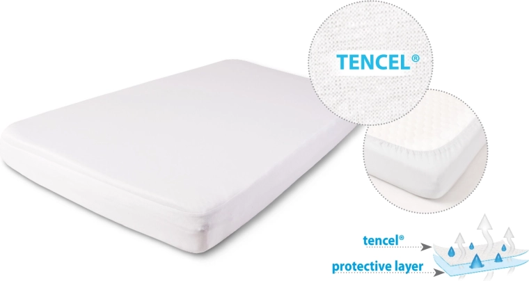 Lenzuolo con angoli double-face in fibra naturale Tencel che unisce la morbidezza della seta e l’elevata capacità assorbente con resistenza e facile manutenzione. Lo strato inferiore in membrana PU traspirante non lascia penetrare i liquidi ma permette al materasso di respirare – scelta ideale per bambini e persone sensibili o allergiche.