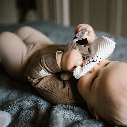 Quando viene afferrato, il giocattolo emette un suono delicato, mentre le diverse texture e le etichette stimolano il tatto e la coordinazione mano-occhio.