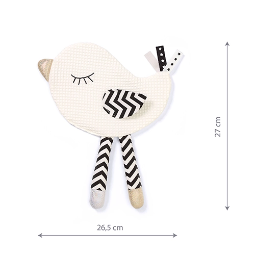 Il doudou Little Birdie della collezione BabyOno Blink&Smile combina morbidezza, sicurezza e stimolazione sensoriale, tanto amata dai bebè. Gli elementi a contrasto in bianco e nero attirano l’attenzione dei neonati, mentre i tessuti morbidi e le etichette invitano ad essere esplorati con le ditine. La forma leggera e facile da afferrare è perfetta per passeggino, culla e viaggi.