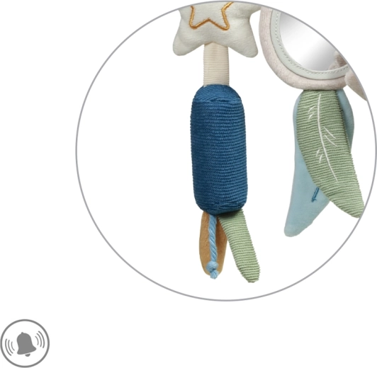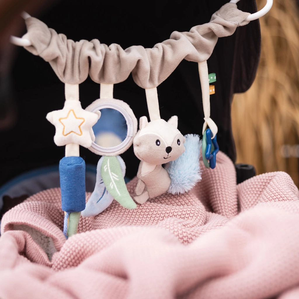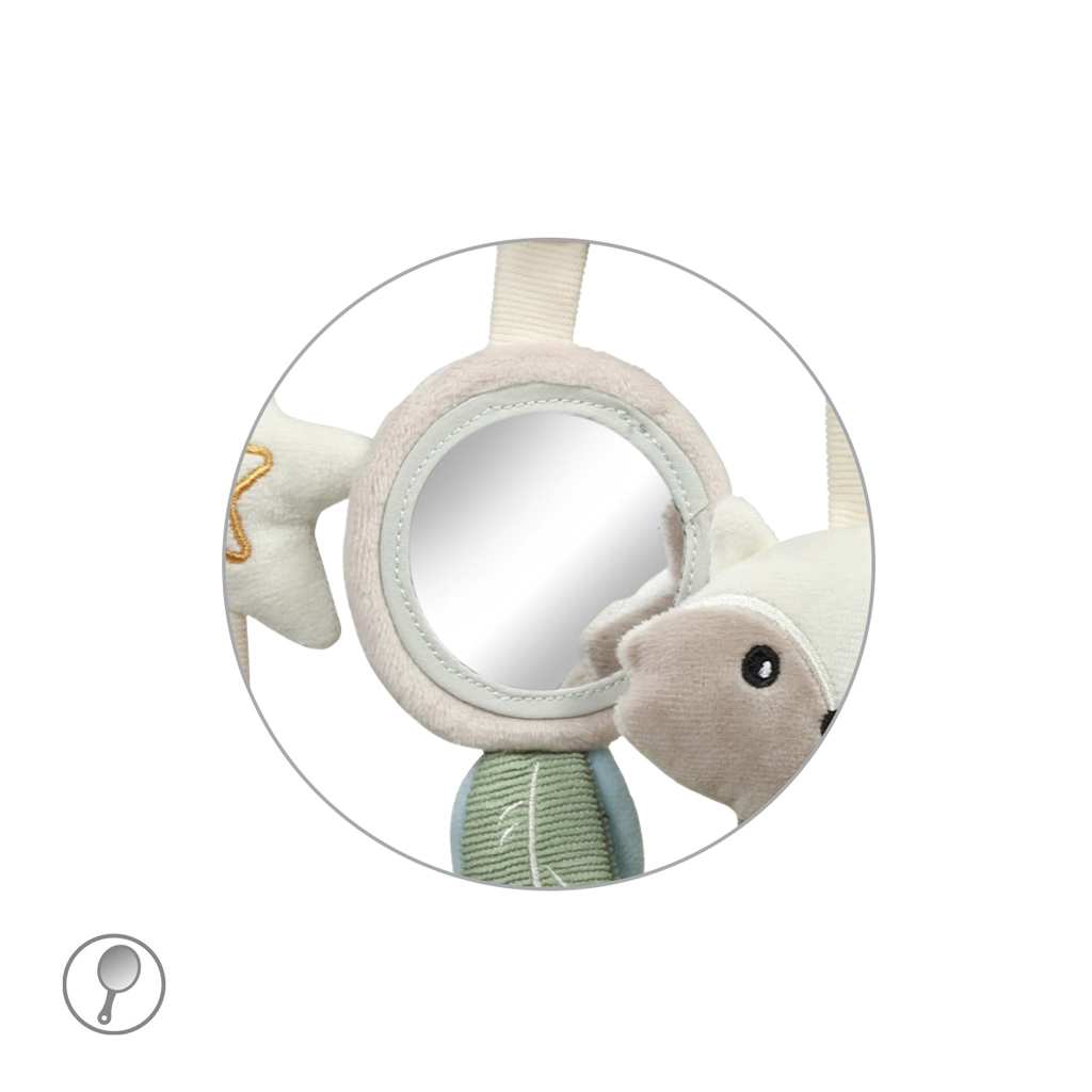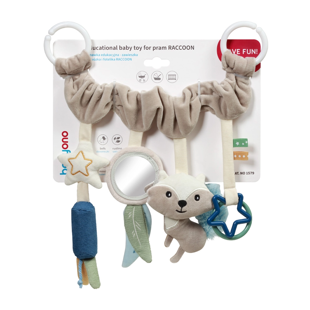 Include elementi amati dai più piccoli: specchietto flessibile per scoprire il proprio riflesso, foglie fruscianti e coda del procione per allenare l’attenzione, campanellini dal suono delicato per calmare e un mordicchiatore a forma di stella che dà sollievo durante la dentizione. Dettagli ben studiati mantengono alta l’attenzione del bambino e favoriscono la coordinazione mano-occhio.
