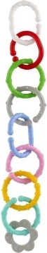 Gli anelli e le forme si collegano facilmente e restano ben uniti, così i bambini possono creare catenelle e agganciare i giochi al passeggino o al seggiolino auto.