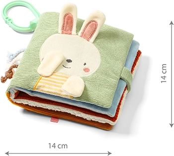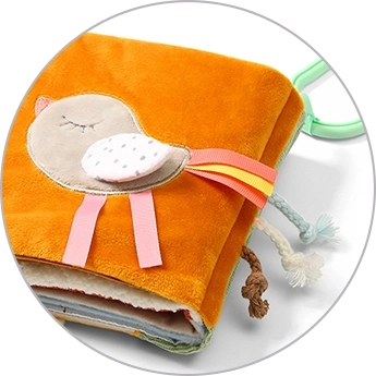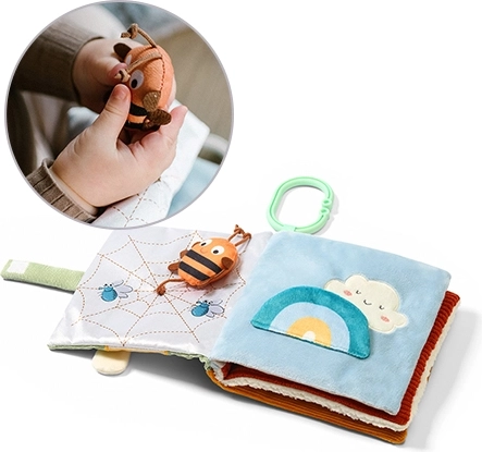 Il pratico clip consente un facile fissaggio a passeggino, seggiolino auto o lettino, ideale sia a casa che in viaggio. Il libro ha una struttura leggera e compatta pensata per le manine, e i suoi colori naturali e tenui con motivi di animaletti non distraggono ma stimolano delicatamente la vista. Laccetti, nodini ed elementi rimovibili con chiusura a strappo favoriscono l’allenamento della presa e la coordinazione.