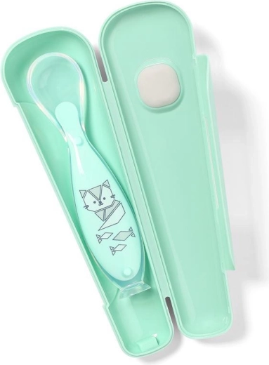 Con questo cucchiaio l’alimentazione sarà più semplice e igienica. La morbida testina in silicone è delicata su gengive sensibili e primi dentini, mentre la ventosa permette di appoggiare il cucchiaio senza contatto con superfici sporche. La custodia compatta mantiene il cucchiaio pulito in borsa, nel fasciatoio e durante i viaggi.