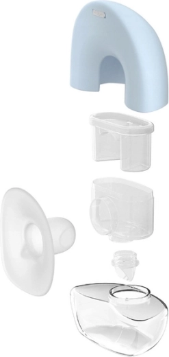 Numero minimo di parti per una manutenzione rapida; in confezione spazzolino, cavo USB‑C, misuratore del capezzolo, 3 misure di coppe, biberon in tritan e sacchetto portaoggetti.