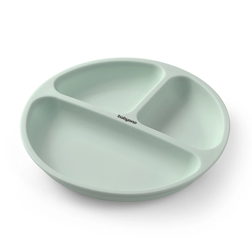 Scoprite una tavola intelligente con il piatto in silicone per bambini BabyOno. La grande ventosa aderisce saldamente alle superfici lisce e aiuta a prevenire rovesciamenti o cadute del piatto. I tre scomparti separano le porzioni e facilitano l’introduzione di nuovi alimenti nella dieta.